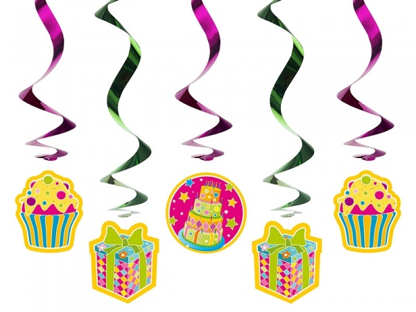Závěsné spirály s obrázky dárečků, cupcakes a dortem.