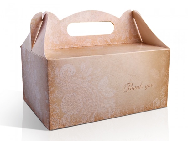 Barevná papírová krabička na výslužku se vzorem. Na přední straně nápis Thank you. Plná svatebních koláčků určitě potěší každého svatebčana.
