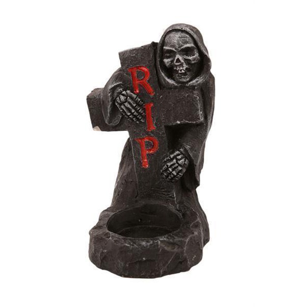 Keramický svícen v podobě hřbitovního kamene je svělou dekorací na halloweenskou párty.